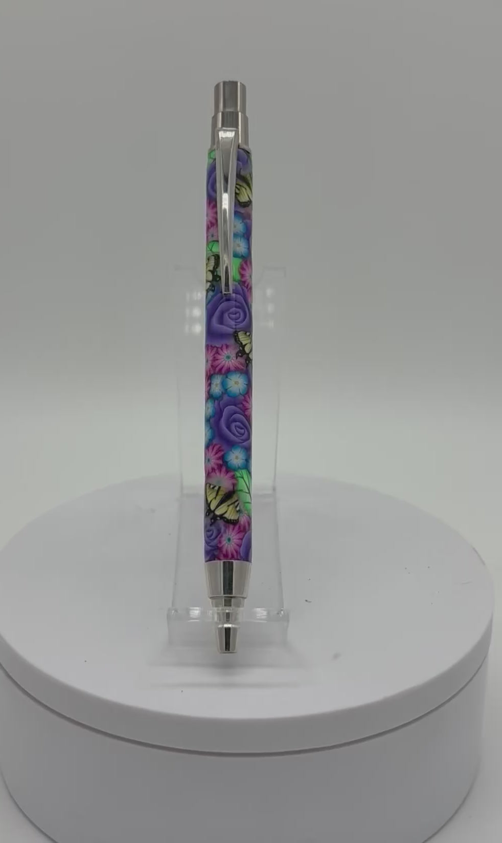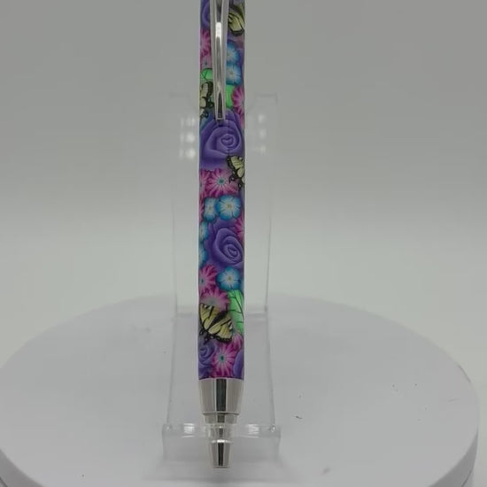 What an awesome ball point click pen. This handmade pen is made with polymer clay for the body, where each flower and butterfly is hand placed to make this beautiful pattern. The hardware is made with 100% solid sterling silver made in the USA. It is a one of a kind must have for any pen collector.