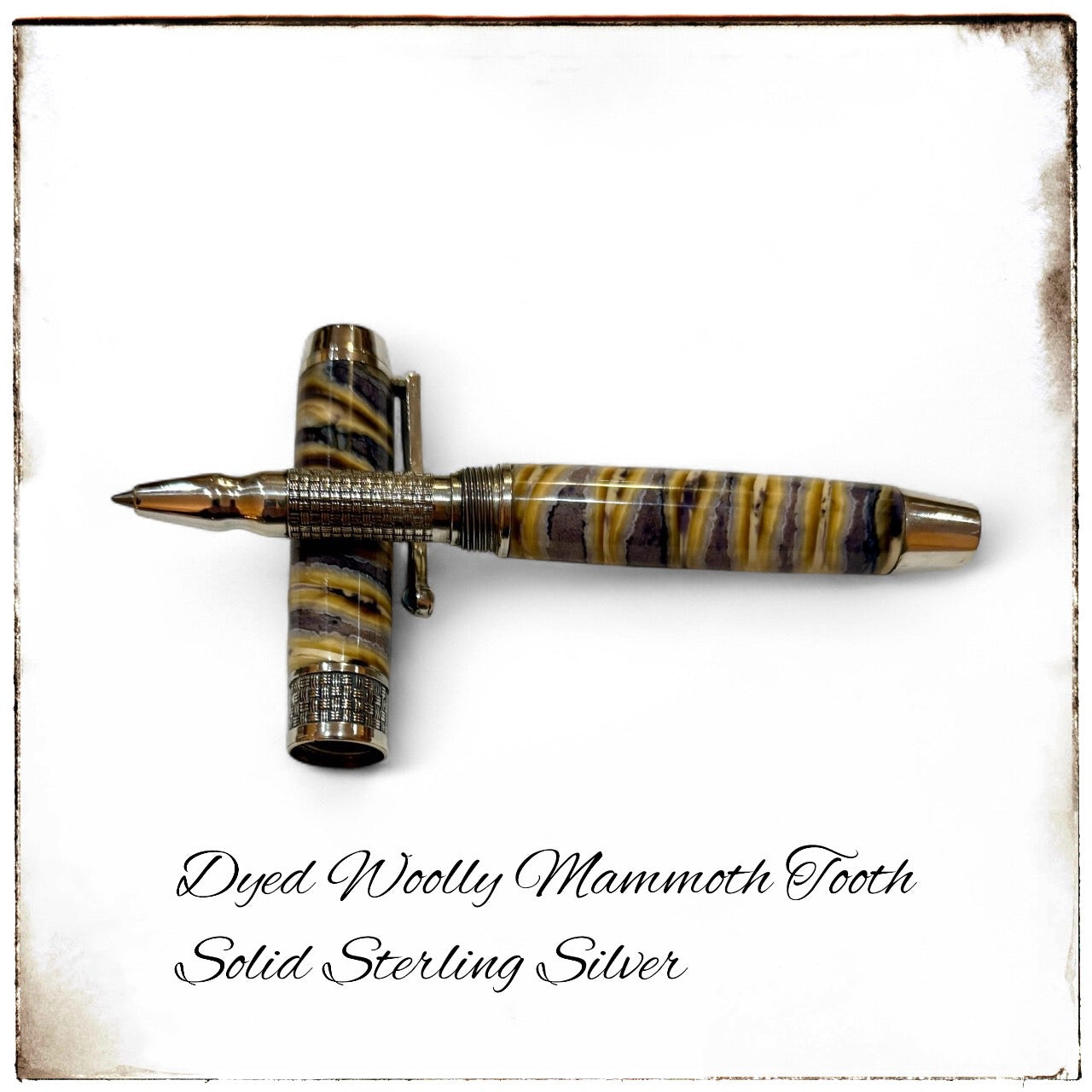 This is a one of a kind dyed woolly mammoth tooth with sterling silver hardware. The tooth was discovered in Russia, then cut and dyed in Canada. I turned the tooth on a lathe and placed it on a beautiful 100% solid sterling silver rollerball hardware kit, that was made in the USA.